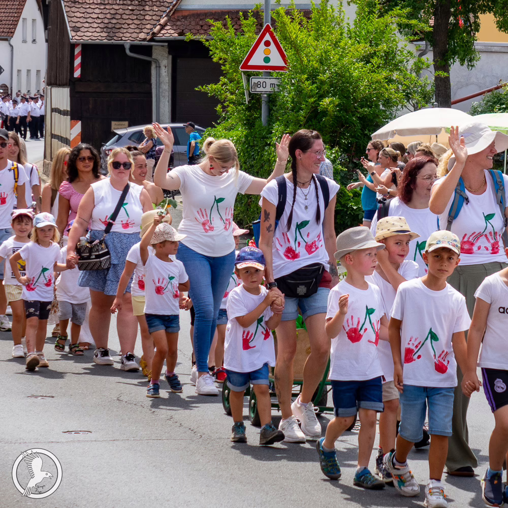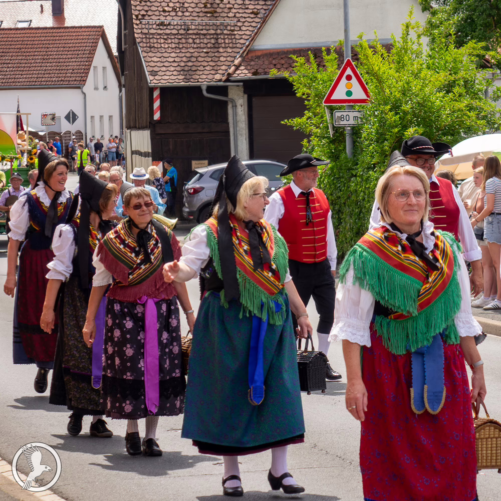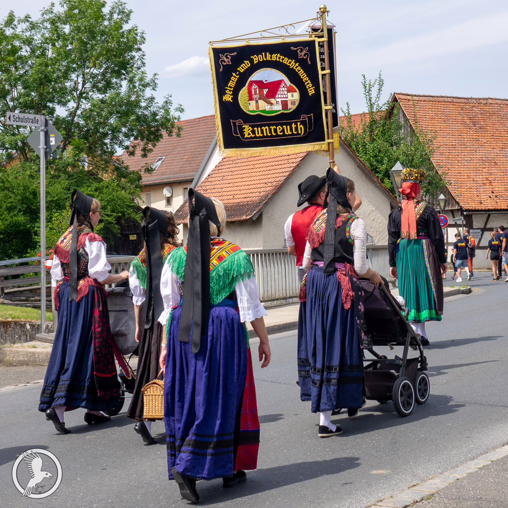 Mehrere Trachtenvereine aus Kunreuth und Oberehrenbach nahmen am Umzug teil und präsentierten stolz ihre fränkische Trachtentradition: farbenfrohe Gewänder mit individuellen Mustern sowie handgefertigte Mieder, Röcke und Schürzen. Diese Trachten unterscheiden sich deutlich von den typischen Dirndl- und Lederhosen-Stilen aus Oberbayern. Hier dominiert keine blau-weiße Alpen-Ästhetik, sondern regional geprägte Designs und handwerkliche Detailarbeit. In Franken steht insbesondere die Bewahrung der Tradition im Mittelpunkt: Historische Trachten wurden erhalten oder im Rahmen der Trachtenbewegung der Fränkischen Schweiz bewusst erneuert.