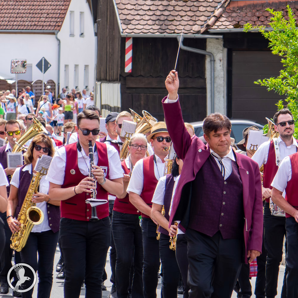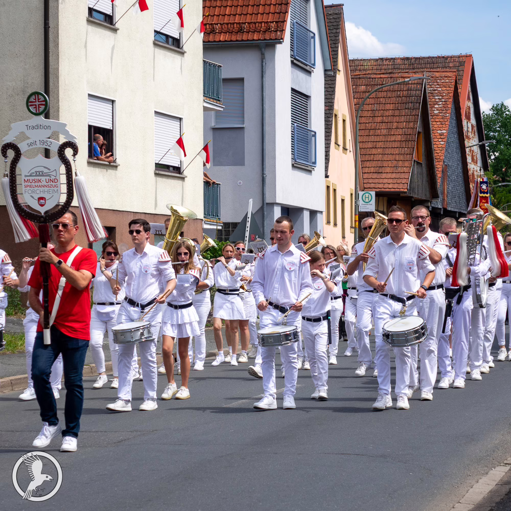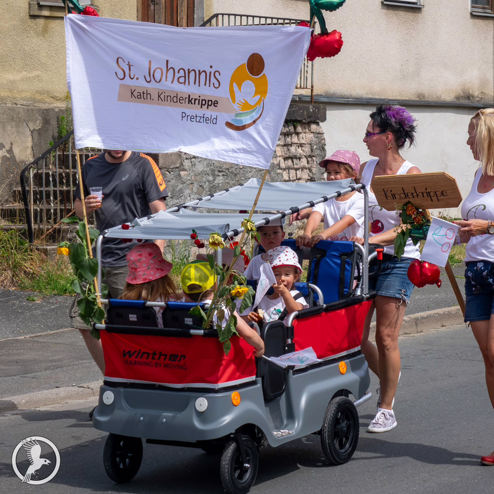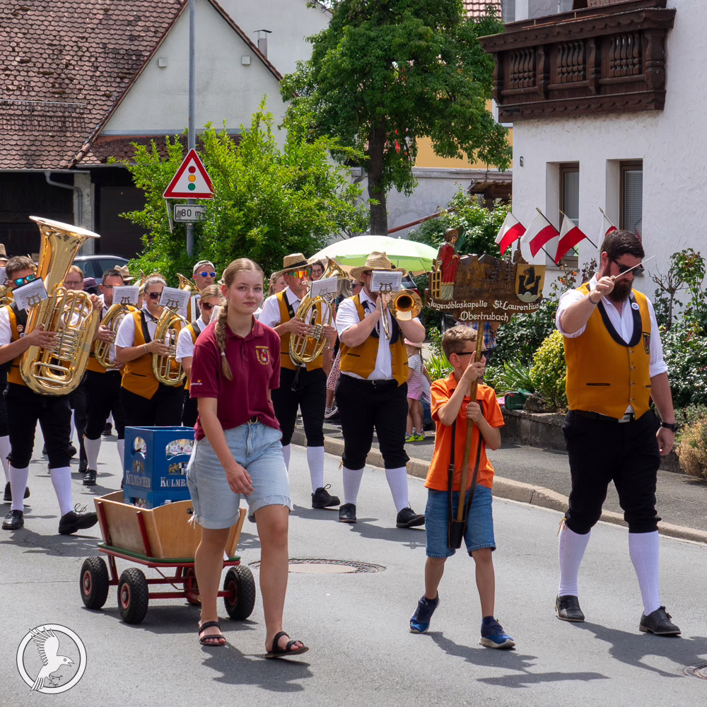 Ein bedeutender Teil des Umzugs war die mitreißende musikalische Begleitung: Der Musikverein Pretzfeld eröffnete mit traditionellen Blasmusikklängen und prägte mit seinem Können und seiner Verbundenheit zur örtlichen Kultur den Festzug. Auch die Jugendblaskapelle Obertrubach sorgte für frischen Wind: Ihre jungen Talente überzeugten mit klaren Blechbläserstimmen und einer optimistischen, rhythmischen Stimmung. Der Musik- und Spielmannszug Forchheim ergänzte das Klangbild mit peppigem Flöten- und Trommelspiel und verlieh der Parade zusätzliche Dynamik. Am Nachmittag setzte dann die Blaskapelle Unterleinleiter auf dem Pretzfelder Keller den musikalischen Höhepunkt: Sie spielte zünftige Polkas, Walzer und Märsche, die das Sitzen im Biergarten mit einem fröhlichen Takt untermalten und das Festpublikum begeisterten.