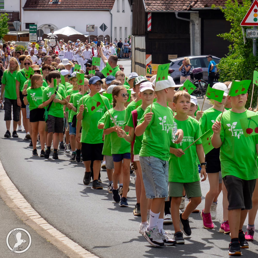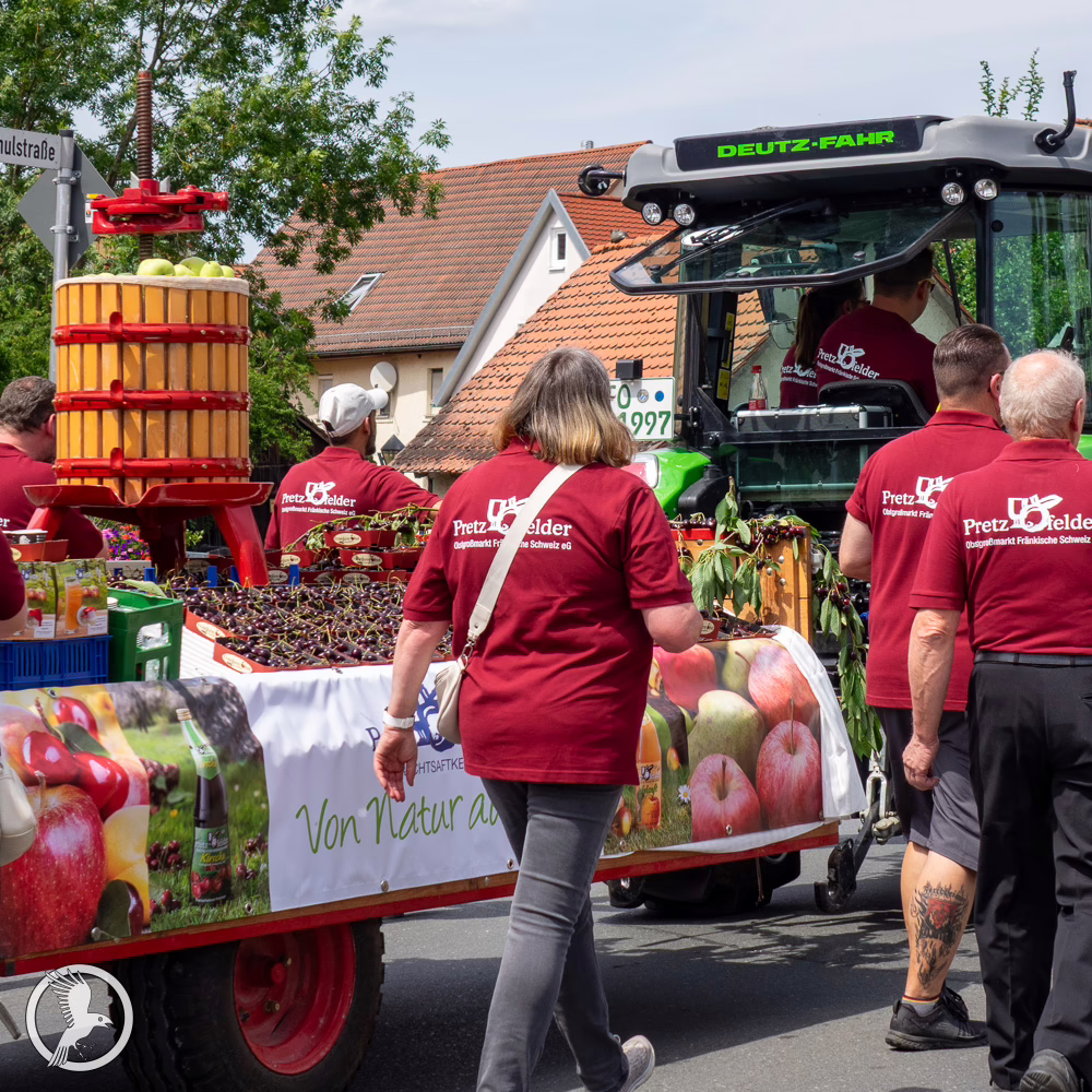 Am Sonntag (20.07.2025), dem Höhepunkt des 55. Fränkischen Kirschenfests, schien bei rund 30 °C die Sonne und verwandelte Pretzfeld in ein echtes Fotomotiv. Über 30 Vereine mit etwa 900 Teilnehmern zogen in farbenprächtiger Tradition durch den Ort – ein Umzug der Superlative, der die Menschen verzauberte. Zahlreiche prominente Gäste verliehen dem Fest zusätzliche Würze: die amtierende Forchheimer Bierkönigin Karolin I., die die fränkische Bierkultur stolz präsentierte, die charmante Fränkische Kirschenkönigin Michaela Vogel, die die süße Seite des Festes verkörperte, sowie die Bad Staffelsteiner Thermenkönigin Jennifer Blodgett. Auch Regierungsvertreter gaben sich die Ehre: Staatsminister Thorsten Glauber und MdL Michael Hofmann nahmen am Umzug teil und würdigten damit die herausragende Bedeutung dieses Traditionsevents. Die örtliche Bevölkerung säumte die Straßen, applaudierte begeistert und zeigte regen Anteil. Es herrschte eine herzliche, generationsübergreifende Atmosphäre, in der echte Gemeinschaft gefeiert wurde.